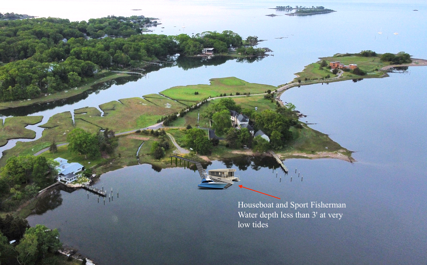Now a dock goes in. The permit with the state requires "Any barge utilized in the execution of the work authorized herein shall occur only during periods of higher water to prevent the barge from resting on, or coming into contact with, the substrate at any time." ref https://portal.ct.gov/-/media/...The barge is there full time, in apparent violation of their permit.